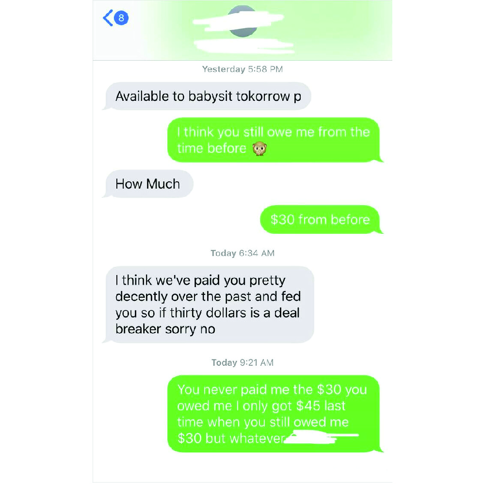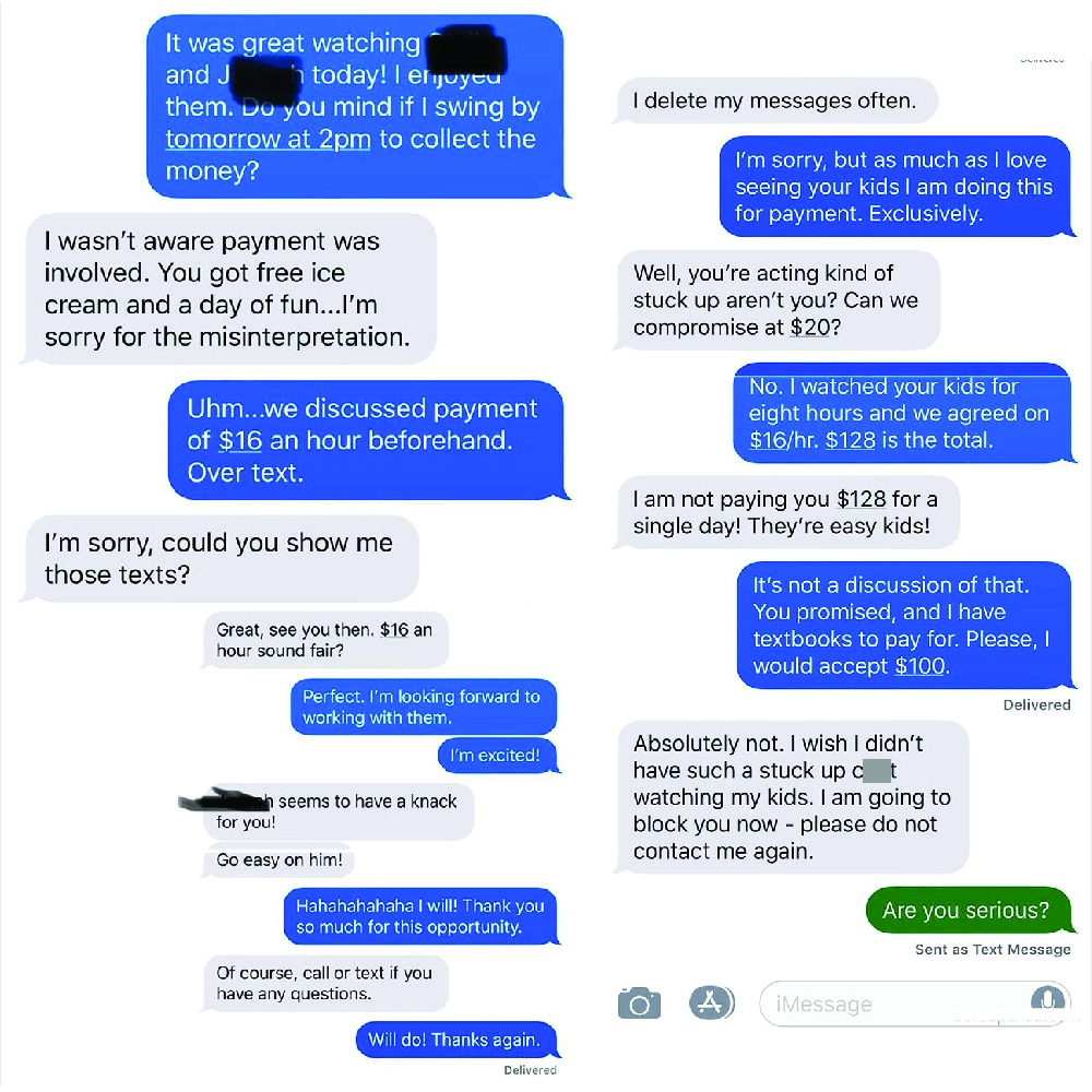 $15 an hour for two kids that need constant attention is totally reasonable. Not only did the parents have the audacity to question the babysitter’s rates, but they also patronized them about how they should be grateful for the $10 they’re willing to pay.