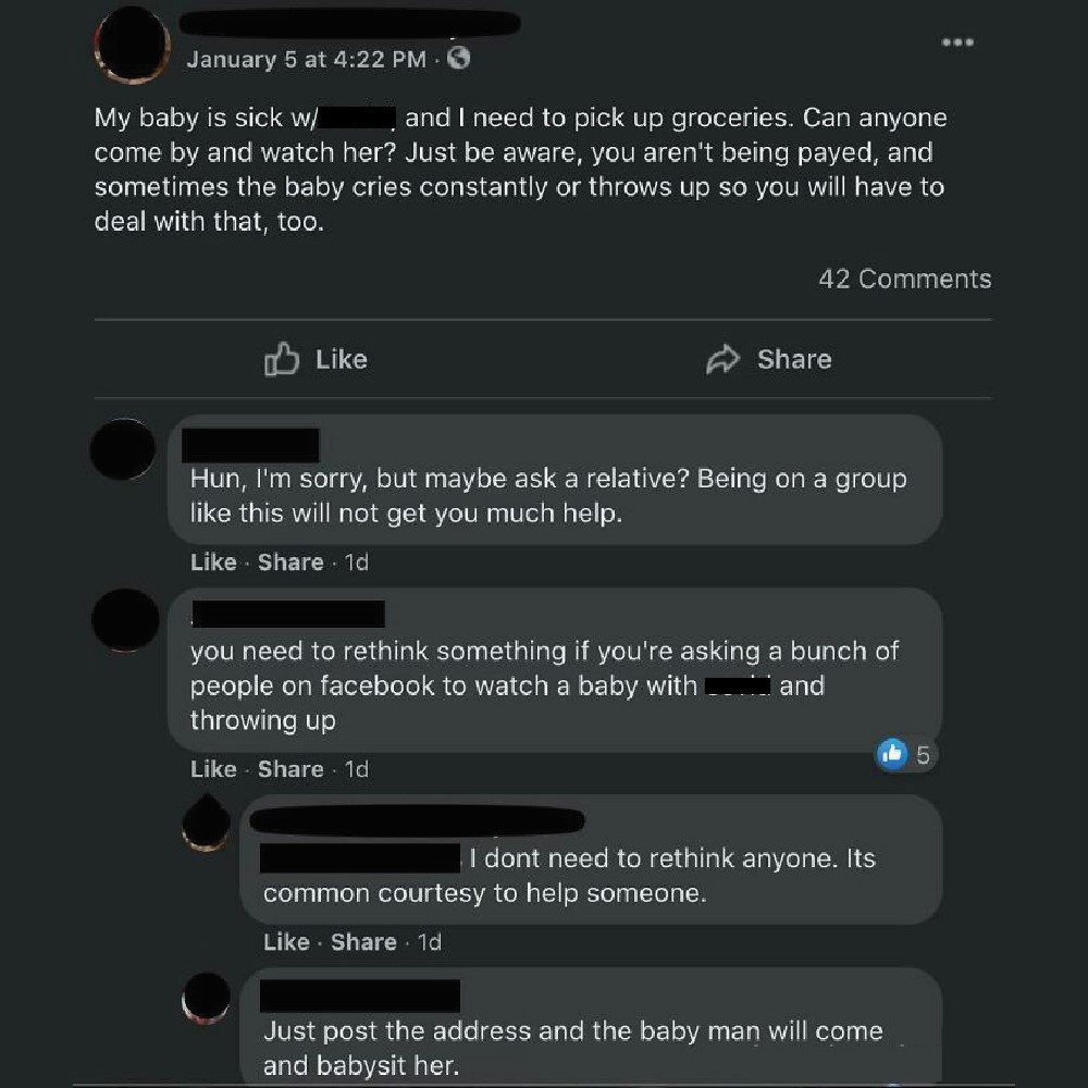 Posting on a public page looking for an unpaid babysitter who would care for a sick child that’s prone to throwing up won’t get them anywhere. The parent is quite ungrateful, terming it “common courtesy” for people to help each other. Why would someone look after a stranger’s infected child?