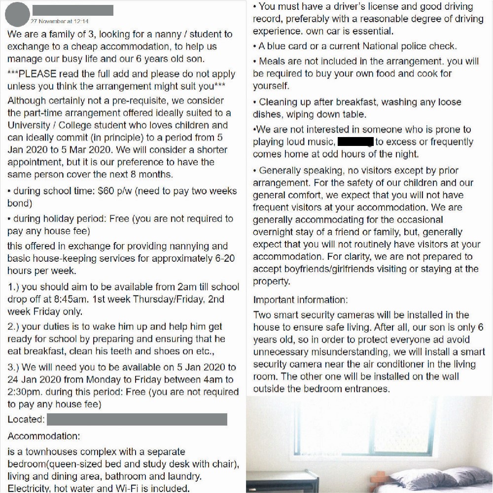 There’s so much going on in this job advertisement. First of all, the parent says they will pay for the job by giving the nanny a room. That would be okay had the nanny been asked to work for a few specific hours each day.