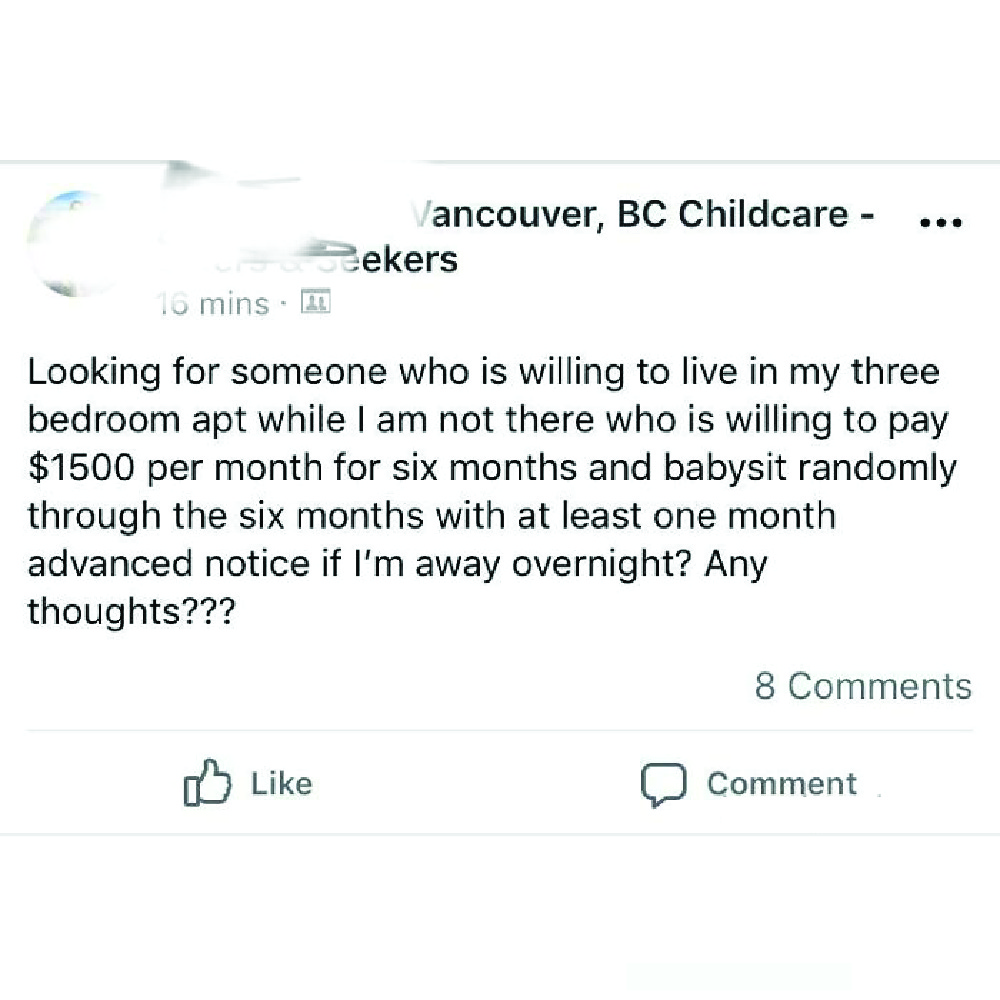 That’s not the worst as they would be staying at the couple’s condo. This seems like this could work for a homeless person seeking accommodation. At those rates, this is the kind of babysitter they would attract. However, it’s not the worst.