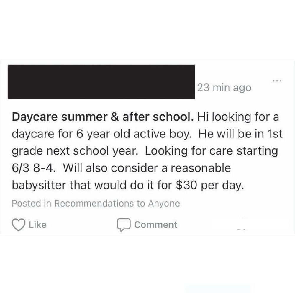 Short and sweet, this advertisement is looking for a daycare for a six-year-old boy. Alternatively, the parent would be okay with a babysitter too if they would work from eight in the morning to four in the afternoon for $30.