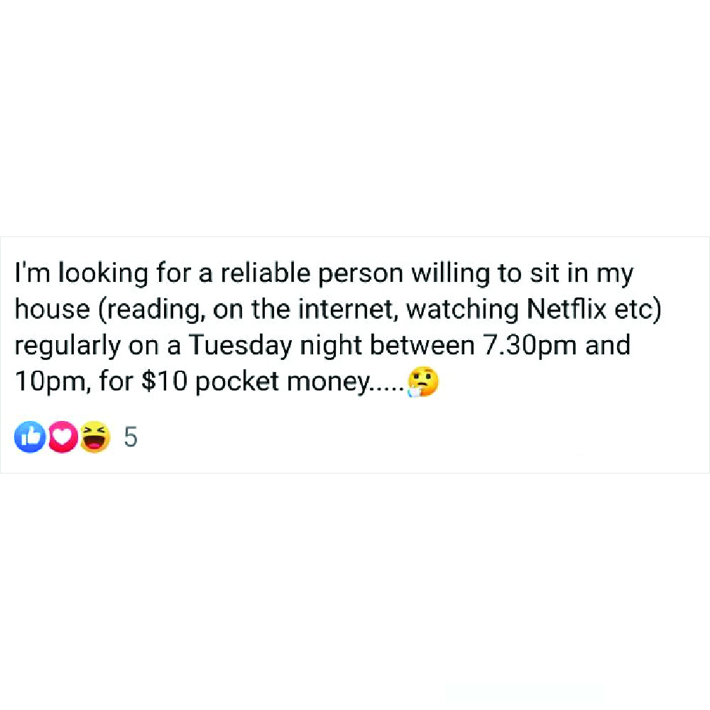 Speaking of pocket money, this seems like a very tempting advertisement. In search of a reliable person who would sit in a stranger’s home, calmly watch Netflix between 7:30 pm to 10 pm, and earn $10 for it.