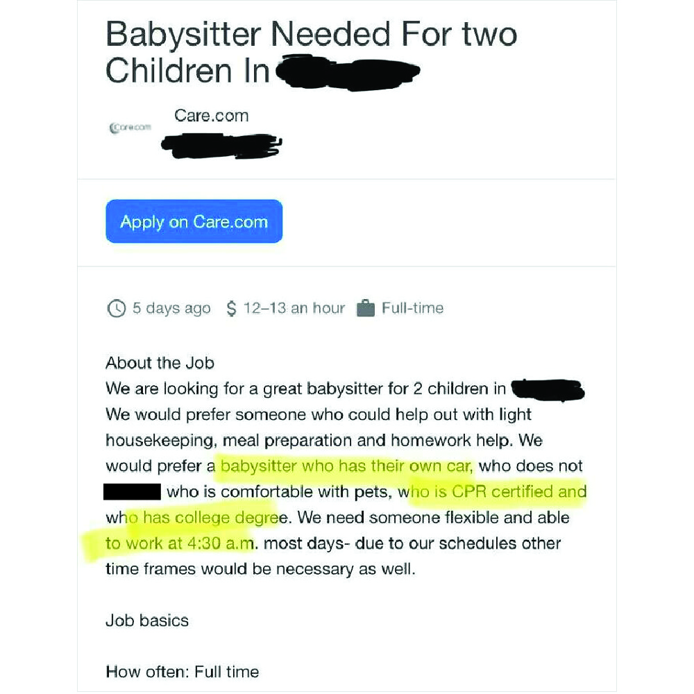 If you’re going to be that classist, you have to have basic spelling skills. They want a babysitter who will work five days of the week from six in the morning to seven at night, but it’s preferable that the sitter is in college.