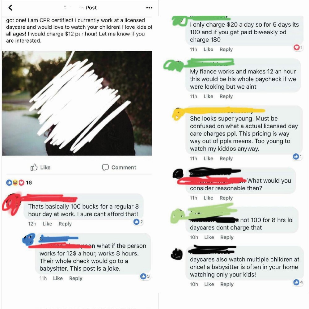 For the first and last time — babysitting isn’t a hobby! For many people, it’s a source of permanent income. Babysitters don’t put thousands of dollars into training and childcare studies for dense parents to call them mental for charging decent rates.