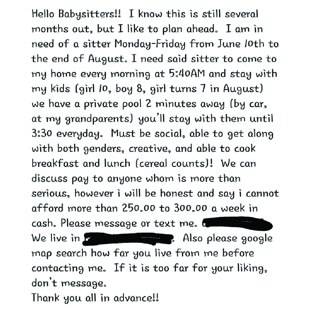 You can tell that this couple knew what a joke their advertisement was. This is why they tried to casually slide in how they have a pool. Reporting to the job at 5:40 am every weekday, the babysitter would have to stick around until 3:30 pm.