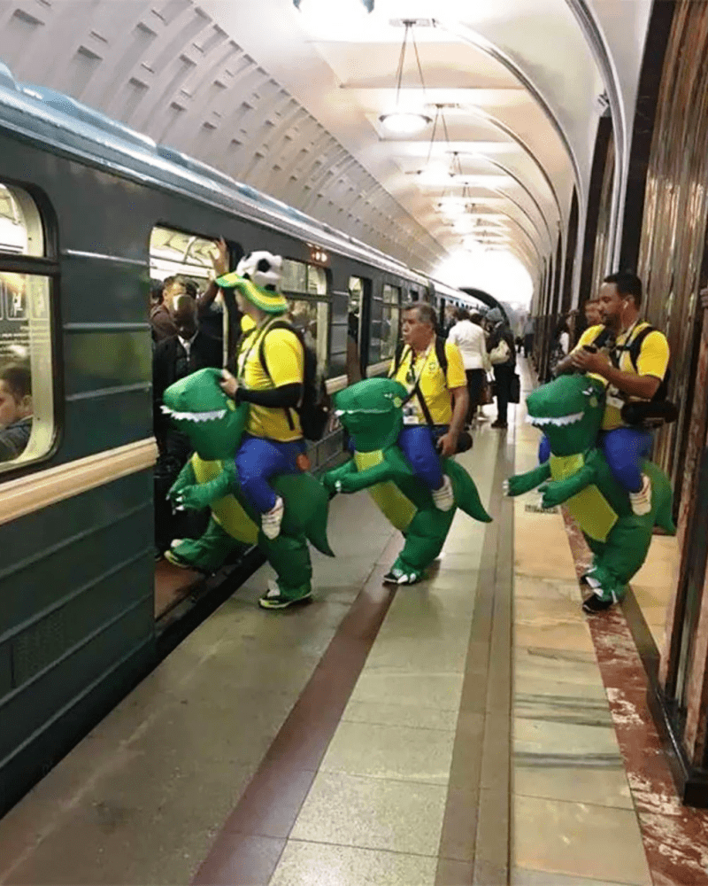 Zumindest der Effekt, klein zu sein, ist in diesem Kostüm ziemlich gut, das muss man zugeben. Was wir auf diesem Bild nicht wirklich verstehen, ist, was Dinosaurier mit Fußball und der brasilianischen Mannschaft zu tun haben.