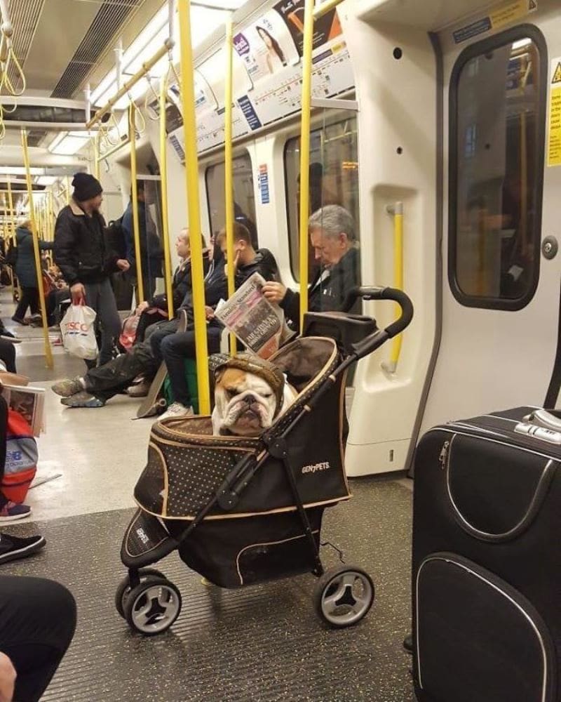 In der U-Bahn können wir uns wohl oder unwohl fühlen, gestresst oder entspannt, wach oder sogar schlafend sein, aber der Ausdruck dieser französischen Bulldogge macht uns sprachlos.