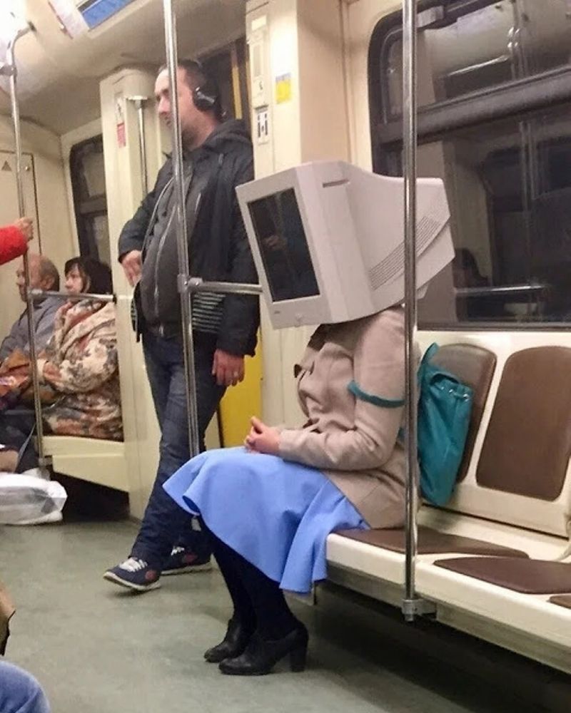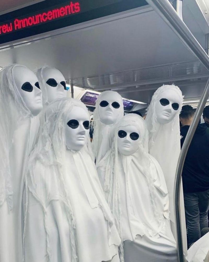 Das Problem ist nicht, dass sich die Leute verkleiden, natürlich nicht, das Problem ist, dass sie nicht einmal in der U-Bahn aus ihrer Rolle fallen! Der Gedanke, dass die Protagonisten unserer Albträume uns minutenlang an einem Ort beobachten könnten, von dem wir nicht weglaufen können, lässt uns die Haare zu Berge stehen.