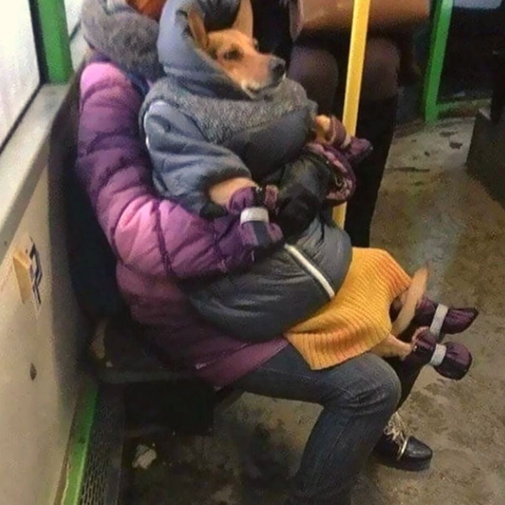 Das Tier scheint sich von der Art und Weise, wie er von seinem menschlichen Vater transportiert wird, nicht im Geringsten gestört zu fühlen, und, was noch besser ist, auch die Menschen neben ihm scheinen nichts dagegen zu haben, dass der Welpe mit ihnen reist.