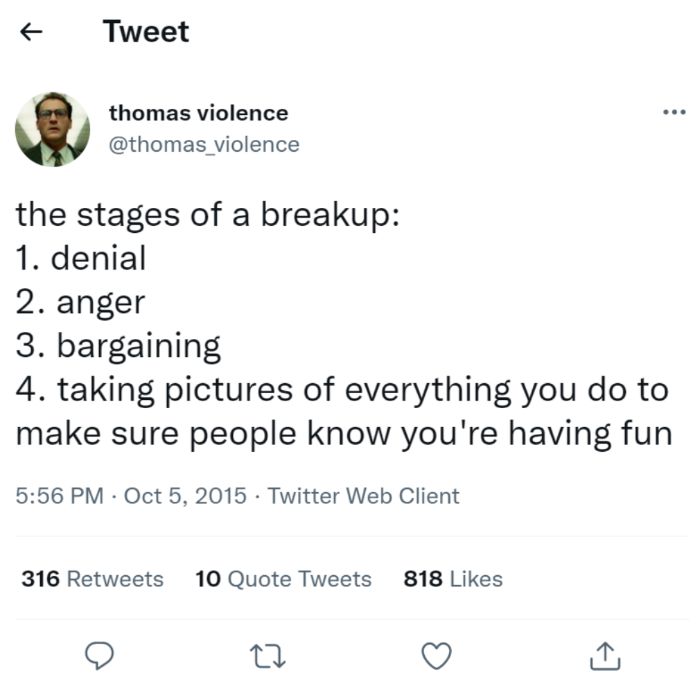 Es gibt einige Dinge, für die es eine allgemeine Formel gibt. Ein gängiges Beispiel dafür ist das recht bekannte Modell der Trauerphasen. Dieser Twitter-Benutzer beschloss, es zu überarbeiten, um auch für eine Trennung eine allgemeine Formel zu entwerfen.