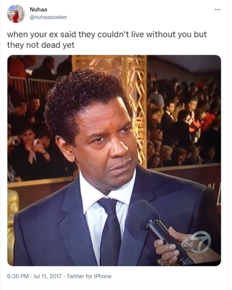 Wenn du erst einmal aus der Situation heraus bist, ist es vielleicht einfacher, einen Sinn für Humor zu haben, auch wenn es keine Zeit braucht, wenn du wirklich über das Drama hinweg bist. Zumindest fand das diese Person, als sie beschloss, dass sie etwas gefunden hatte, das ihre Beziehung zu gut beschrieb, um es zu ignorieren.
