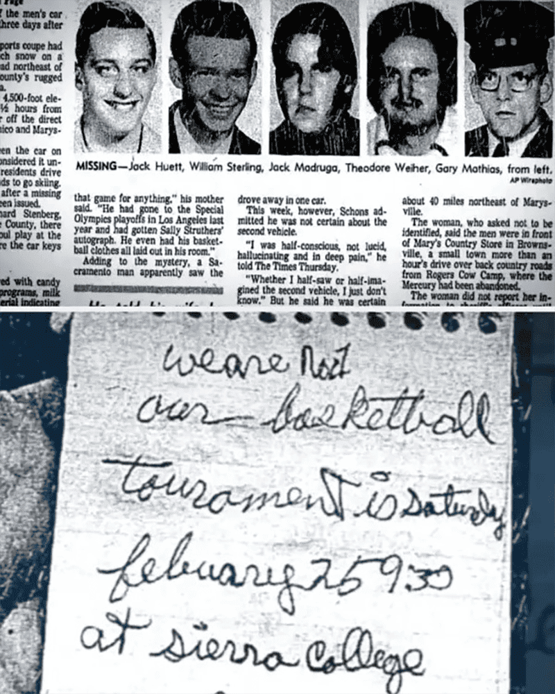 The Yuba County Five, a group of five men, were driving home from a California basketball game in February 1978. They were reported missing when they didn't return home for several days. During a police search, their undamaged car was found 70 miles away from the game they'd attended.